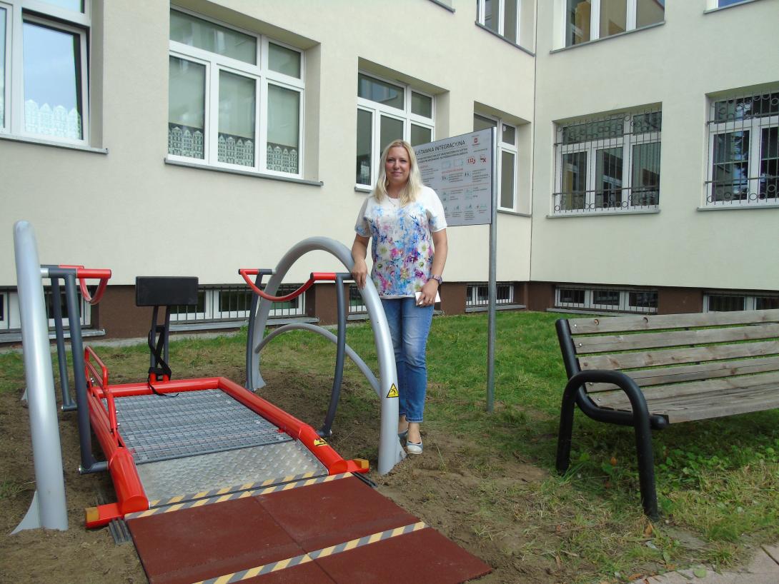 Sylwia Feliks, administrative and economic manager of Primary School No. 5. Jana Pawła II in Gdańsk next to the newly installed TERMA integration swing.