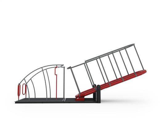 - Ruchome zespolenie platformy osoby niepełnosprawnej na wózku z platformy dla osoby pełnosprawnej pozwala na możliwość zachowania tego samego położenia platformy dla osoby na wózku względem podłoża. Wpływa to na bezpieczeństwo użytkowania, ponieważ ogranicza ryzyko wyjechania z platformy podczas zabawy. Urządzenie posiada także dodatkową konstrukcją uniemożliwiająca przemieszczanie wózka podczas huśtania.