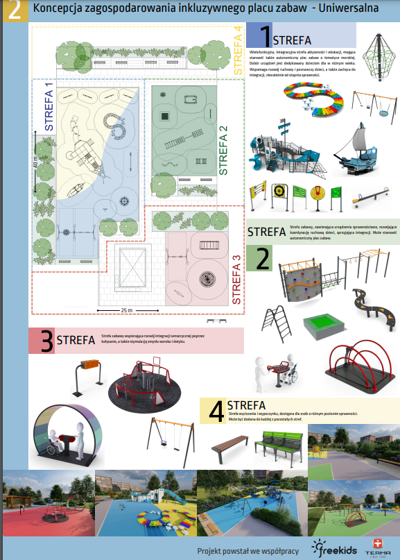 Tylko urządzenia integracyjne, czyli projektowane z myślą o wszystkich użytkownikach dają możliwość bezpiecznej, ciekawej i równej zabawy i takie powinny znajdować się na publicznych placach zabaw. Przestrzeń zaprojektowana w sposób uniwersalny, czyli pozwalający na dostęp osób o różnym poziomie sprawności, o różnych potrzebach, z możliwością elastycznego wyboru stopnia trudności oraz intensywności zabawy to właściwy kierunek w projektowaniu miejsc rekreacyjnych.