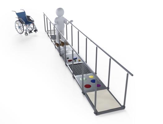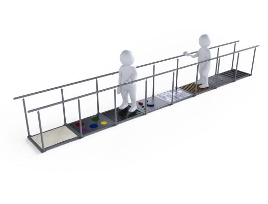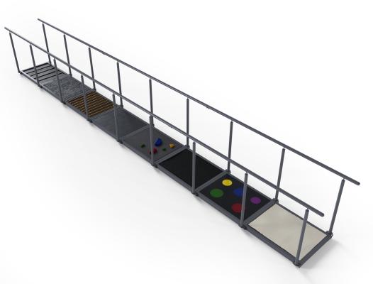 | Ścieżka sensoryczna przyczynia się do stymulacji układu nerwowego, poprzez dostarczanie zmiennych bodźców. Terapia integracji sensorycznej wspomaga rozwój układu nerwowego poprzez naukę rozpoznawania, segregacji oraz odpowiedzi na dany bodziec. | Możliwość treningu chodu przy wsparciu barierek, możliwość kształtowania wzorca chodu na zmiennych podłożach. |