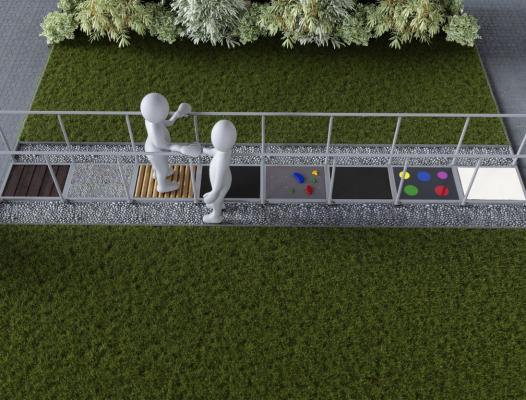 - Ścieżkę sensoryczną tworzy się ją poprzez zastosowanie ciągu zróżnicowanych nawierzchni, dających odmienne odczucia odbierane gołymi stopami. W ścieżce sensorycznej znaczenie ma faktura poszczególnych elementów oraz ich temperatura, co działa na zmysł dotyku oraz bodźce wzrokowe – różnorodne kolory materiałów, które ciekawie mogą przechodzić jeden w drugi.